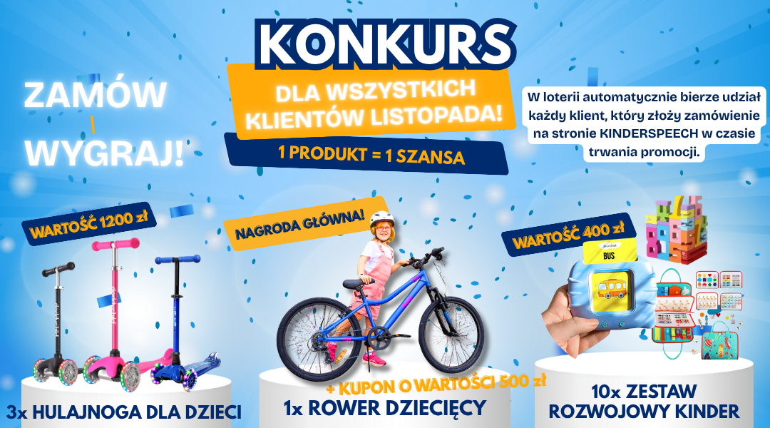 • W konkursie automatycznie biorą udział wszyscy klienci, którzy dokonają zakupu na stronie www.kinderspeech.pl w czasie jego trwania.